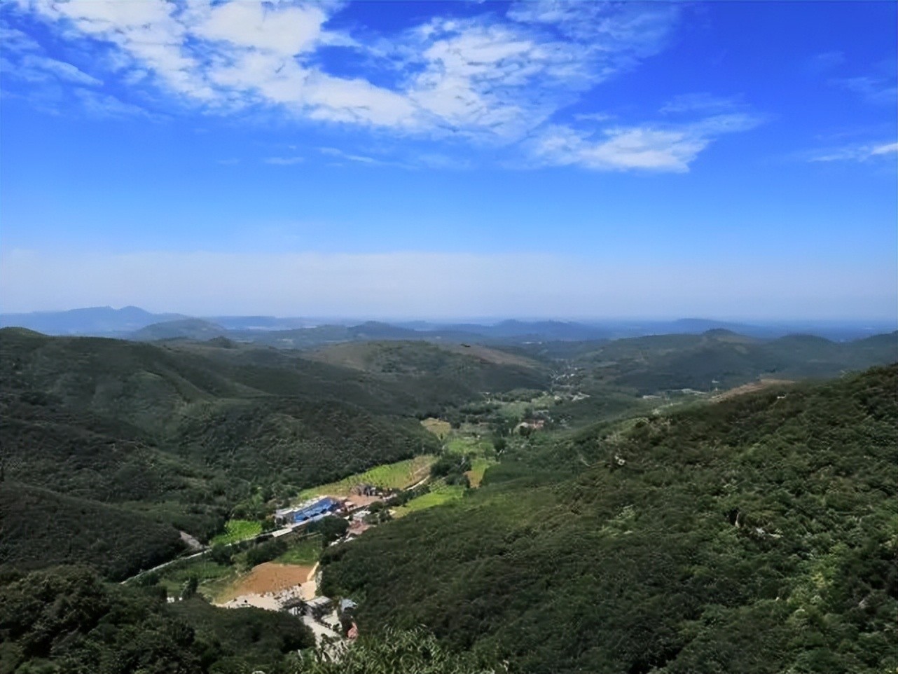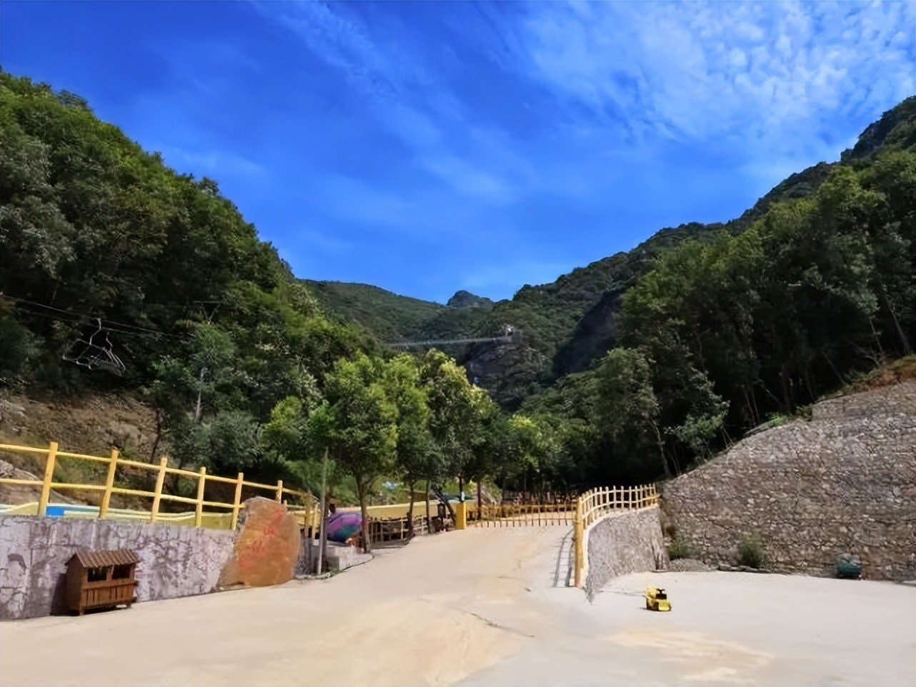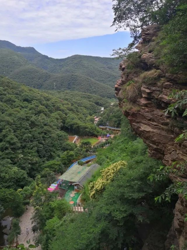 俯看景区从大门到峡谷一段路,蓝色长带就是漂流滑道了,也就是所谓的中原第一漂了。
