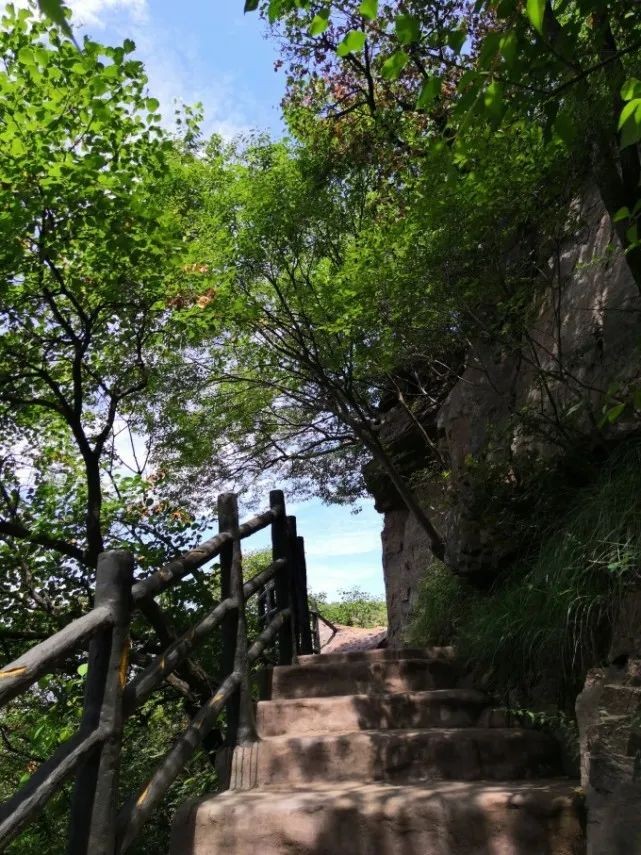 回望台转个弯就是第一层栈道结束、第二层栈道开始的岔口,这里也可以走台阶直接上山顶,其实上面还有较短的曲折栈道和几个观景台。