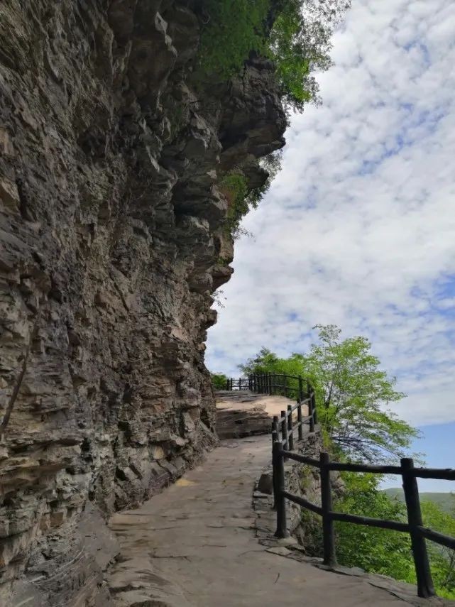 天井下坡后,开始走景区最有特色的悬崖栈道了,这一层依山体倾斜上升,明显是人工依崖开凿修建。