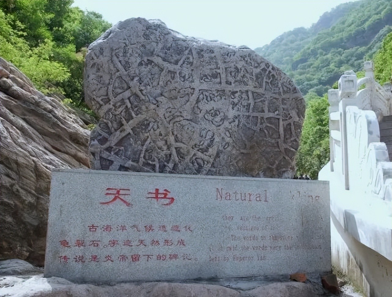这是天书石,又叫龟裂石,形成于古生代,距今约5.7—2.3亿年。亿万年前激烈的地壳运动,让原始海底的嶙峋山石,从汹涌澎湃的大海底部腾空跃出,耸立于灯台架地表,展现了地质演变的发展历史,形成了千姿百态的奇妙景观。石面平整光滑,纹路清晰,线条优美,颇像古文字符号,但又无人识得其内涵,故曰“天书”。