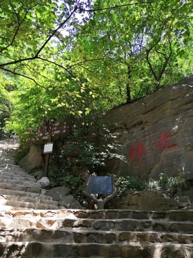 就又到了玻璃桥这头售票处的分叉口,有路牌显示,走下去回看崖壁上写着:神游。