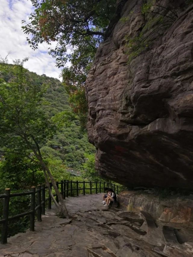 第二层栈道先上坡转个弯,就开始倾斜下坡,有游客在凸出崖下阴凉处休憩,这一带相继叫仙人棚、情侣棚。