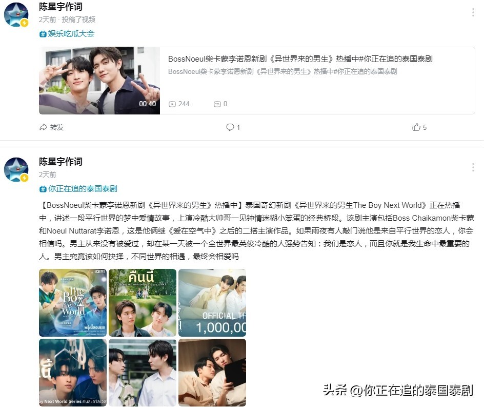 泰国奇幻新剧《异世界来的男生The Boy Next World》正在热播中,讲述一段平行世界的梦中爱情故事,上演冷酷大帅哥一见钟情迷糊小笨蛋的经典桥段。该剧主演包括Boss Chaikamon柴卡蒙和Noeul Nuttarat李诺恩,这是他俩继《爱在空气中》之后的二搭主演作品。