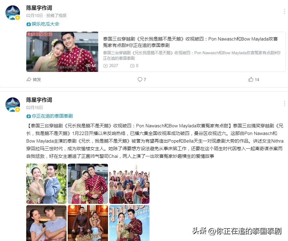 【泰国三台穿越剧《兄长我是鹅不是天鹅》收视破四:Pon Nawasch和Bow Maylada欢喜冤家有点甜】