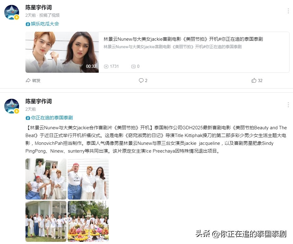 泰国制作公司GDH2025最新喜剧电影《美丽节拍Beauty and The Beat》于近日正式举行开机祈福仪式。这是电影《窈窕淑男的日记》导演Title Kittiphak操刀的第二部多彩少男少女生活主题大电影,MonovichPah担当制作。泰国人气偶像男星林景云Nunew与原三台女演员jackie jacqueline,以及喜剧男星肥象Sindy PingPong、Ninew、sunterry等共同出演。该片原定女主演Ice Preechaya因特殊情况退出项目。