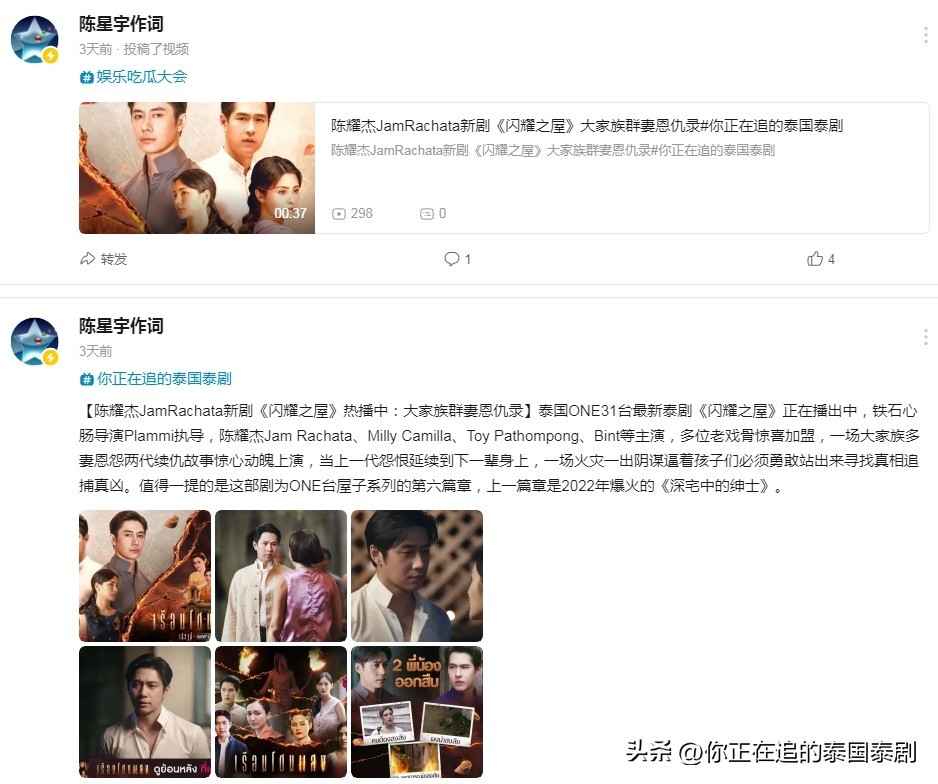 【陈耀杰JamRachata新剧《闪耀之屋》热播中:大家族群妻恩仇录】泰国ONE31台最新泰剧《闪耀之屋》正在播出中,铁石心肠导演Plammi执导,陈耀杰Jam Rachata、Milly Camilla、Toy Pathompong、Plaifah、PBint等主演,多位老戏骨惊喜加盟,一场大家族多妻恩怨两代续仇故事惊心动魄上演,当上一代怨恨延续到下一辈身上,一场火灾一出阴谋逼着孩子们必须勇敢站出来寻找真相追捕真凶。值得一提的是这部剧为ONE台屋子系列的第六篇章,上一篇章是2022年爆火的《深宅中的绅士》。