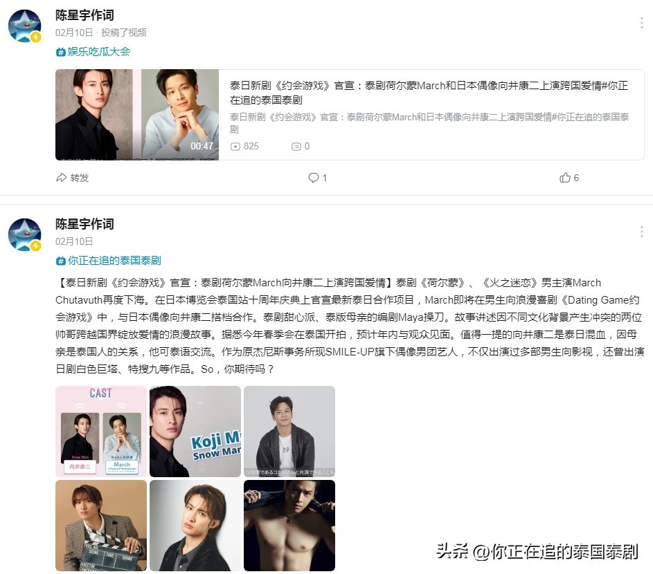 泰剧《荷尔蒙》、《火之迷恋》男主演March Chutavuth再度下海。在日本博览会泰国站十周年庆典上官宣最新泰日合作项目,March即将在男生向浪漫喜剧《Dating Game约会游戏》中,与日本偶像向井康二搭档合作。泰剧甜心派、泰版母亲的编剧Maya操刀。