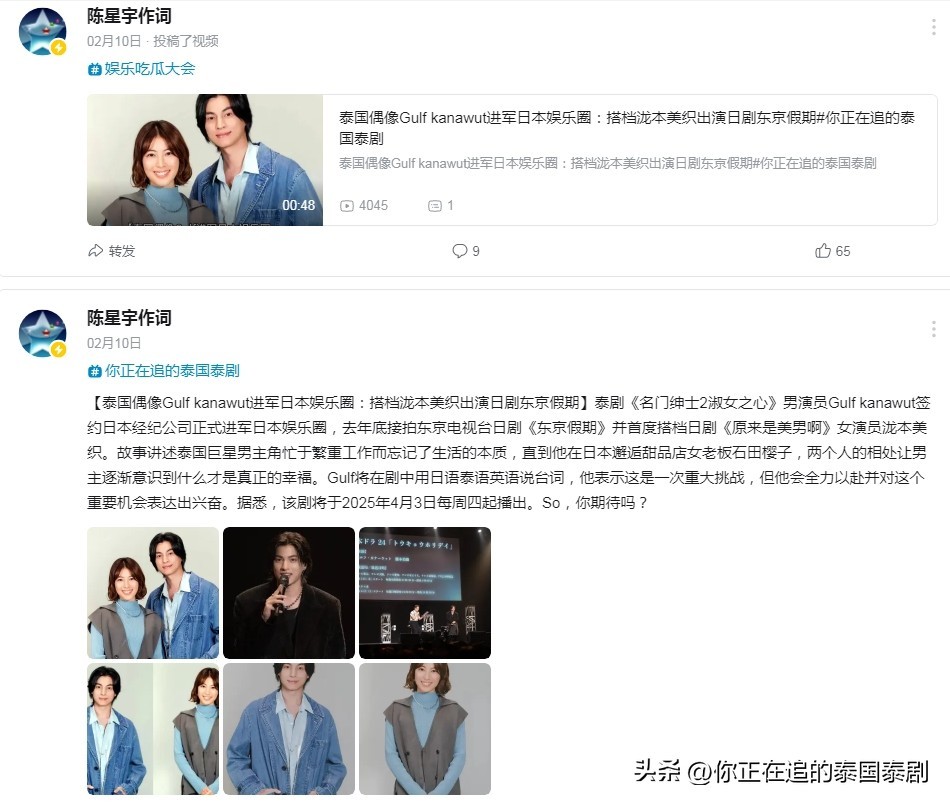 泰剧《名门绅士2淑女之心》男演员Gulf kanawut签约日本经纪公司正式进军日本娱乐圈,去年底接拍东京电视台日剧《东京假期》并首度搭档日剧《原来是美男啊》女演员泷本美织。