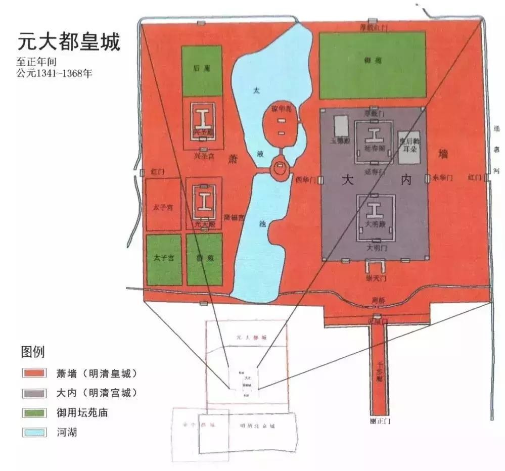 明皇城只沿用了元皇城的西城墙,北、南、东三面依次向外扩展了一些。