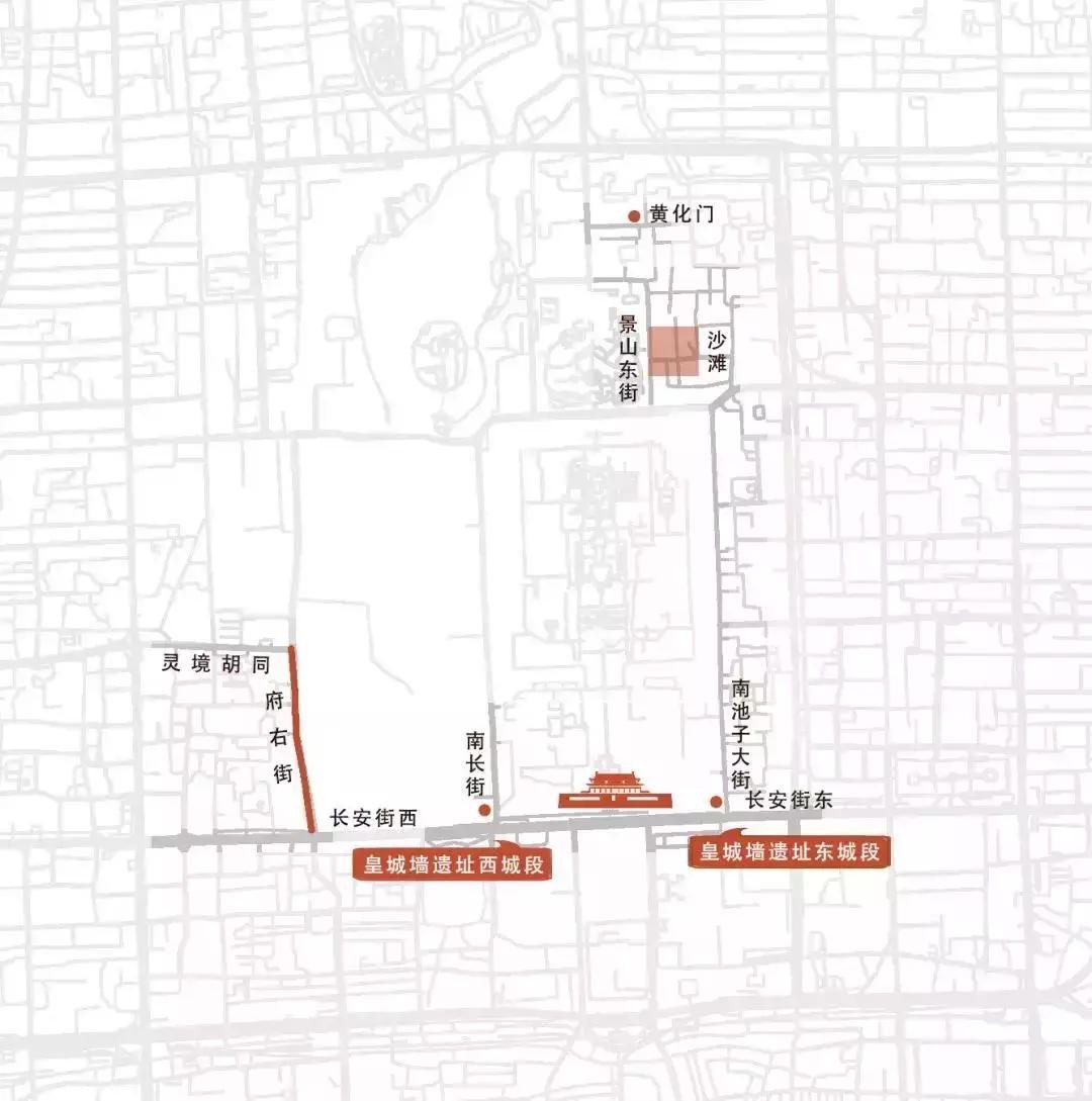 * 天安门东、西两侧约900米长的皇城墙:天安门西至府右街南口一段属西城,天安门东一段在皇城根遗址公园内。* 西城府右街向北至灵境胡同,沿着中南海墙;* 内皇城墙,隐于黄化门,景山北街之北的一带;* 沿景山东街隐于民居至沙滩的一段。