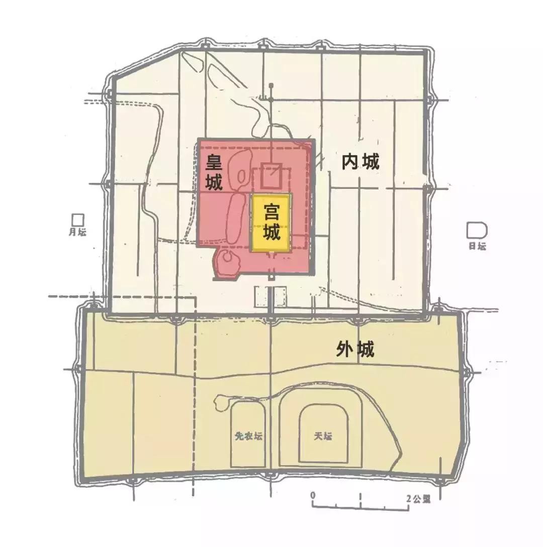 我们先来搞清北京城的结构:北京城的主体就是在元大都城基础上改造而成的,最终形成宫城、皇城、内城、外城四重方城。