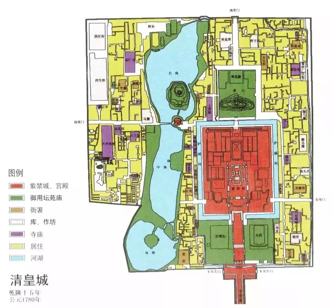 皇城 ≠ 紫禁城紫禁城 :就是现在的故宫,是明清两代皇帝居住的宫城。皇城 :位于旧时内城南部正中的位置,大致相当于以故宫为中心,方圆两公里左右的地方。如今,这个地方早已融入到整个城市当中,丝毫看不出城池的样子。但在明清两代,这四周却耸立着高大的城墙和城门,俨然一座城中之城。