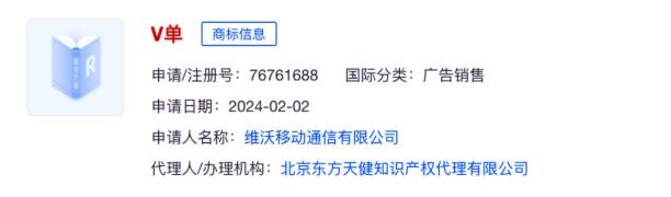 最后值得一提的是,vivo已申请注册“V单”商标,商标状态为“等待实质审查”。