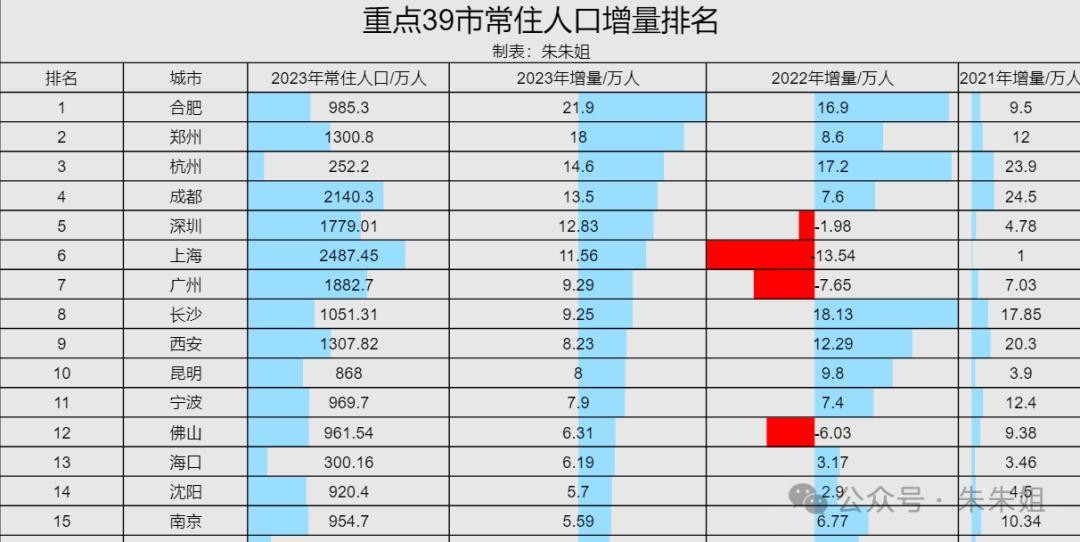 中国39个城市2023常住人口增量排行榜:合肥登顶、重庆垫底