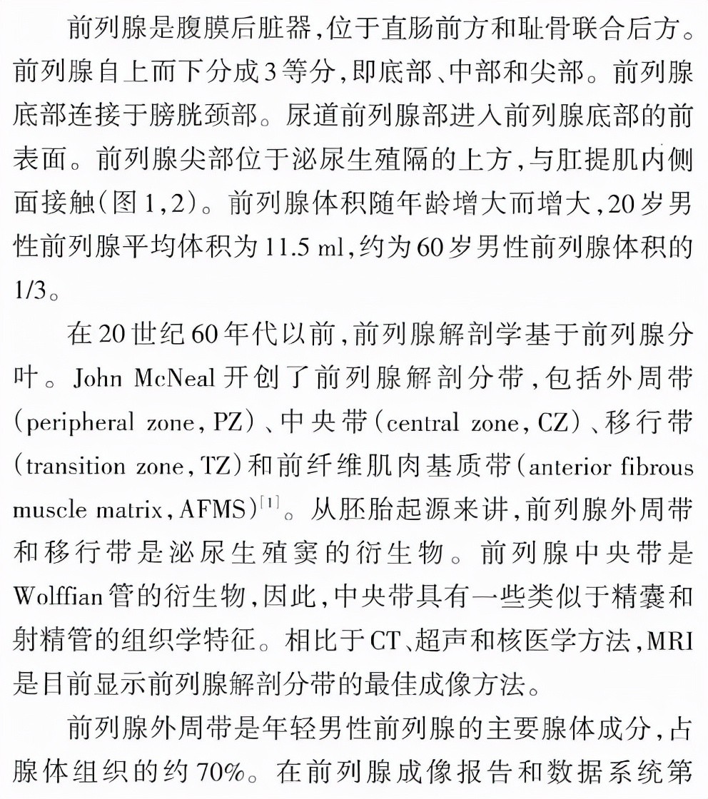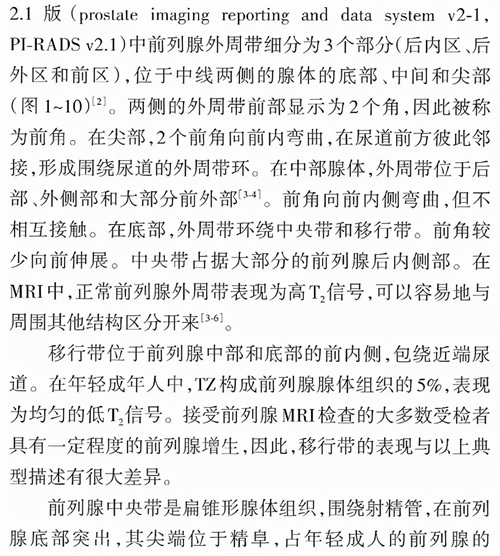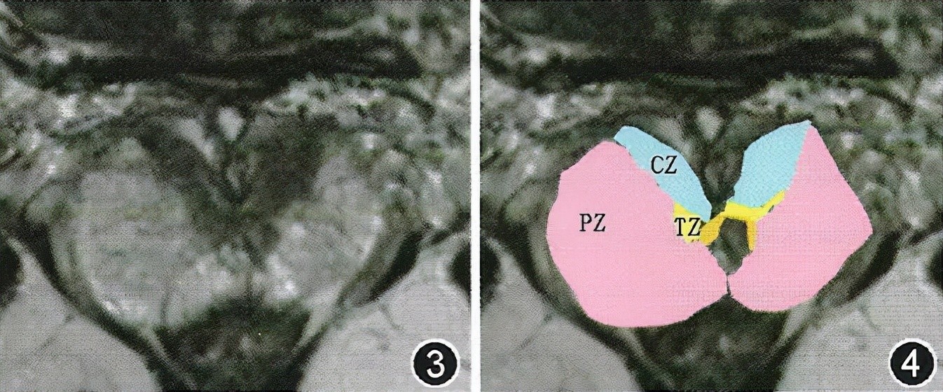 图3,4 前列腺冠状面解剖分区图。图3为前列腺MR检查冠状面T2WI。图4为示意图,粉色为外周带(PZ),黄色为移行带(TZ),橘色为尿道周围带,淡蓝色为中央带(CZ)