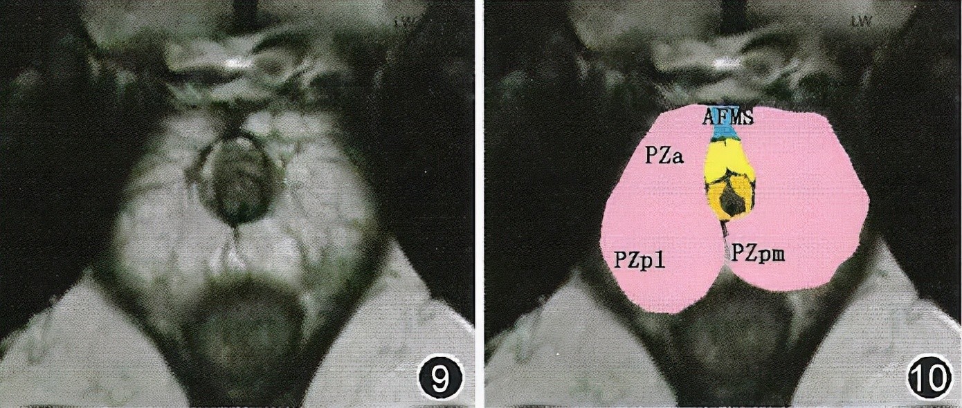 图9,10 前列腺尖部解剖分区图。图9为前列腺尖部MR检查横断面T2WI。图10为示意图, 其中粉色为PZ, 包括PZa、PZpm和PZpl;黄色为TZ; 橘色为尿道周围带; 深蓝色为AFMS