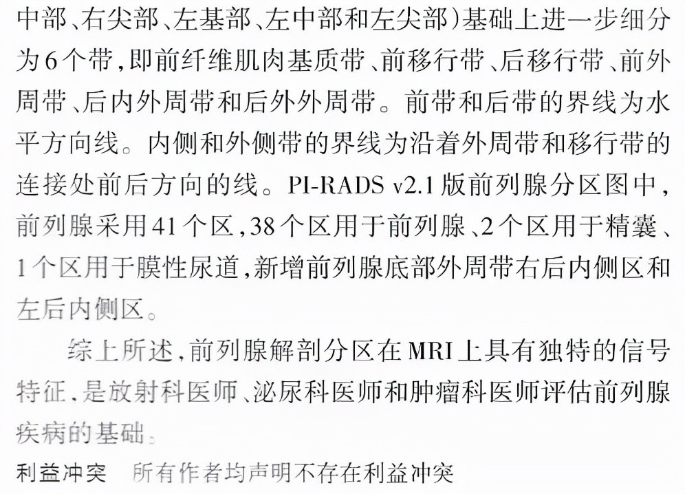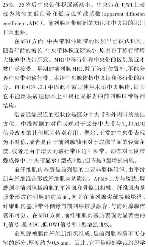 图5,6 前列腺底部解剖分区图。图5为前列腺底部MR检查横断面T2WI。图6为示意图,其中粉色为PZ, 包括前外周带(PZa) 、后内外周带(PZpm) 和后外外周带(PZpl) ; 黄色为TZ, 包括前移行带(TZa) 和后移行带(TZp) ;橘色为尿道周围带; 淡蓝色为CZ; 深蓝色为前纤维肌肉基质带(AFMS)