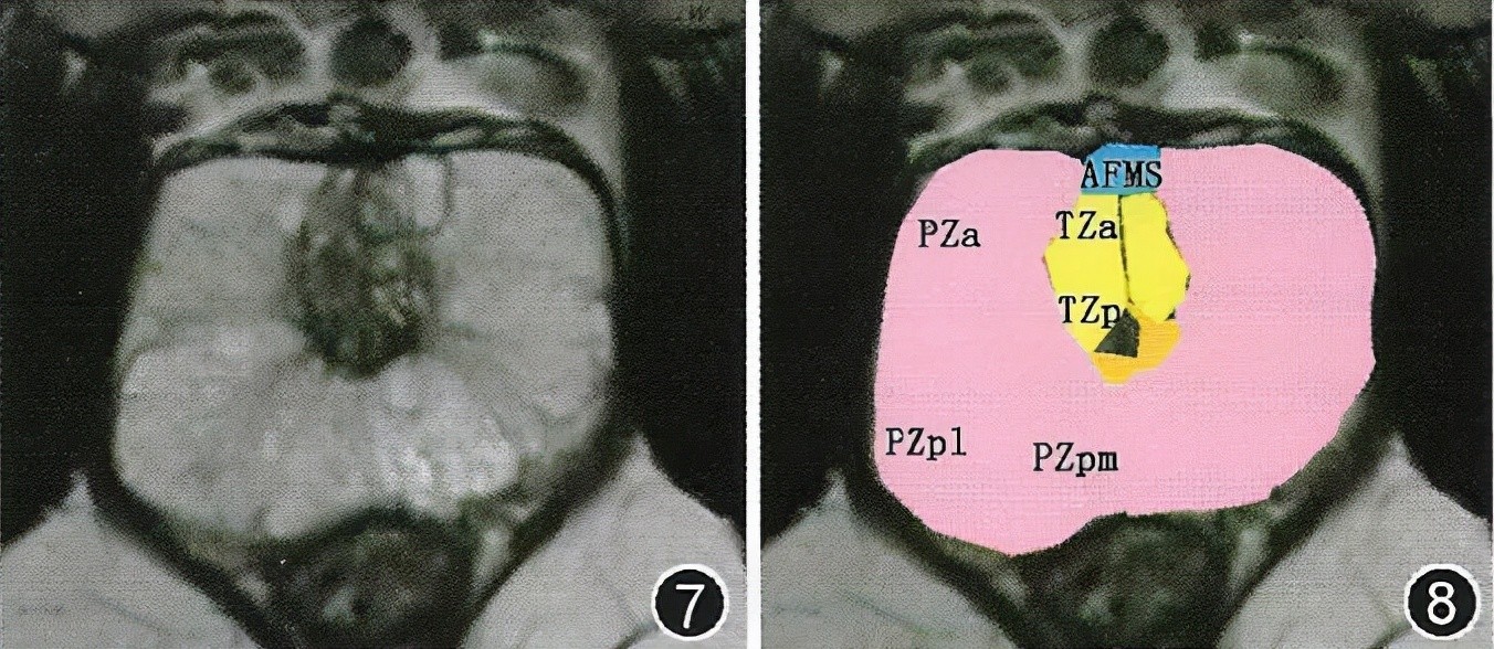 图7,8 前列腺中部解剖分区图。图7为前列腺中部MR检查横断面T2WI。图8为示意图, 其中粉色为PZ, 包括PZa、PZ pm和PZpl; 黄色为TZ, 包括TZa和TZp; 橘色为尿道周围带; 深蓝色为AFMS