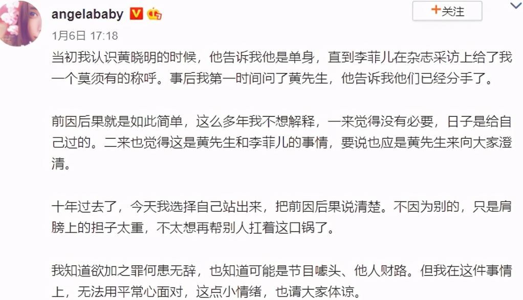 但多年后,baby却首次正面回应了此事,表示自己并不是小三,当时黄晓明和自己说的是单身,黄晓明也站出来护妻,并宣布退出浪姐2。