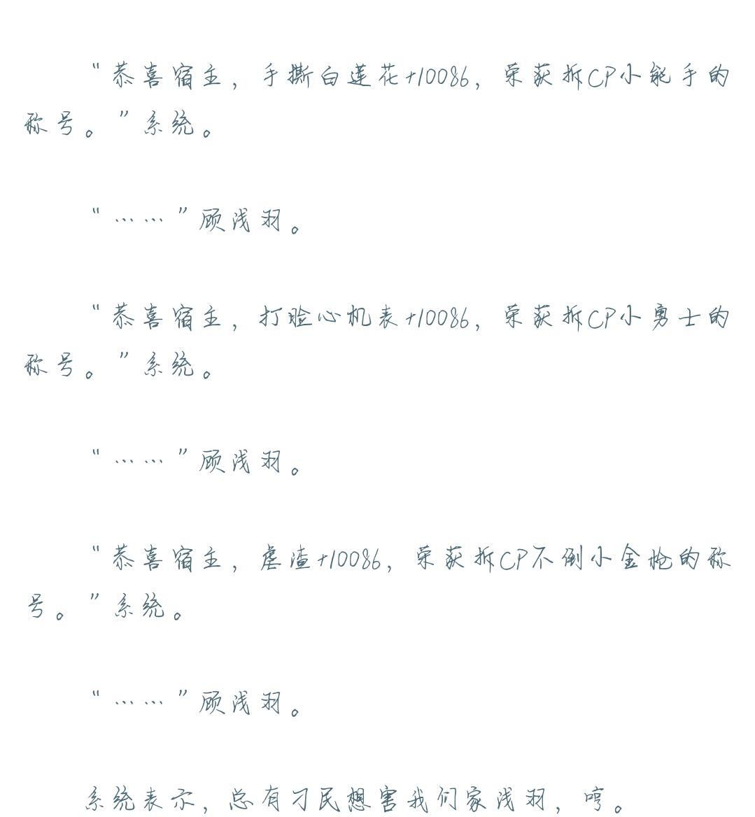 书评:无系统,有的小世界有cp,有的小世界无cp,全看女主心情。虽然连载中,但正文已经完结,故事线已经走完。系统在第一章与女主解绑,正文时已经没有系统,女主不停的在学习,一个小世界学习一个技能并且成为大家,超级厉害,而且虽然每个小世界都会丧失对之前世界的记忆,但是技能一直都在。女主超级有责任心成为了原主就会负起责任,对周围人都好。