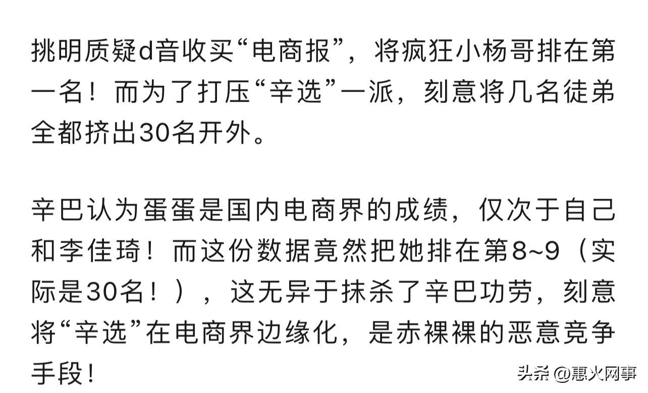 昨日,辛巴开启直播,发泄自己的不满,针对前段时间互联网主播带货排名一顿语言输出,主要是为蛋蛋鸣不平。嫌排的靠后了,辛巴认为,蛋蛋每年的带货金额仅次于辛巴,李佳琦。排名第三。