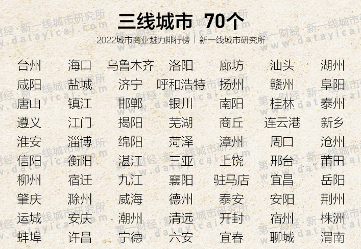 三线城市共70个,浙江台州排第1,最后一名是陕西渭南。