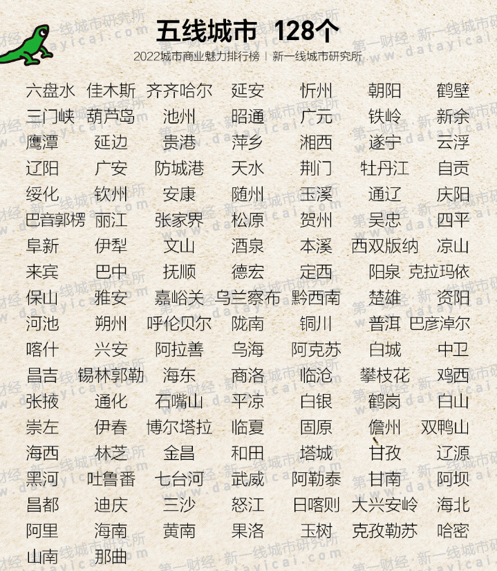 五线城市为128个,贵州六盘水排第1。可以看出,五线城市基本来自西部,贵州、广西、内蒙古、甘肃、新疆等地区的很多城市上榜。