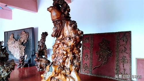 在一副巨大的“寿”字根雕作品前面,是一个寿星模样的作品,高高的额头,大大的葫芦,长长的胡须,一副长寿老者的形象。