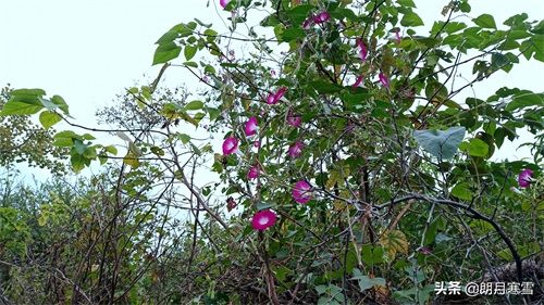 走在浮来山中,因为时值中秋,茂密翠绿的树木已经落叶纷纷,唯独一串串或红或蓝的喇叭花仍然给游客带来生机盎然的感觉。