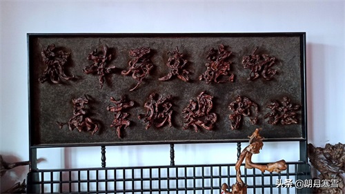 这是十二生肖汉字根雕作品:鼠牛虎兔龙蛇马羊猴鸡狗猪。