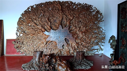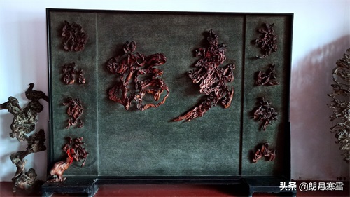 这幅根雕作品的形状像是开屏的孔雀尾部。