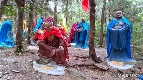 接下来的这三幅照片,是景区内的“五百罗汉”,是一处比较有名的景点之一。从山脚下开始,一直到山顶,分布着形态各异、神态各异的罗汉雕塑。每个罗汉的脚下都写有罗汉的法号。