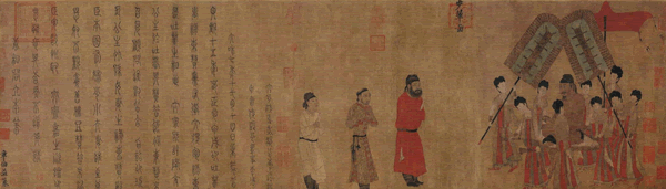 《步辇图》采用的是长卷的形式展现于世人眼前,画幅横长,人物众多,前后数了数共有13人,两拨人对立着分为左右两部分,右边的人物不用多数,坐在步辇上的便是唐太宗,周围宫女环绕,而左边站了3个人,穿红长袍的人一看就是中原装扮,这边是赞礼官,是唐朝的礼仪引导人员,而他后面的身材瘦小的人,衣着不同于旁人,一看就是禄东赞,禄东赞后面的人则也是唐朝官员,负责翻译、记录事件。