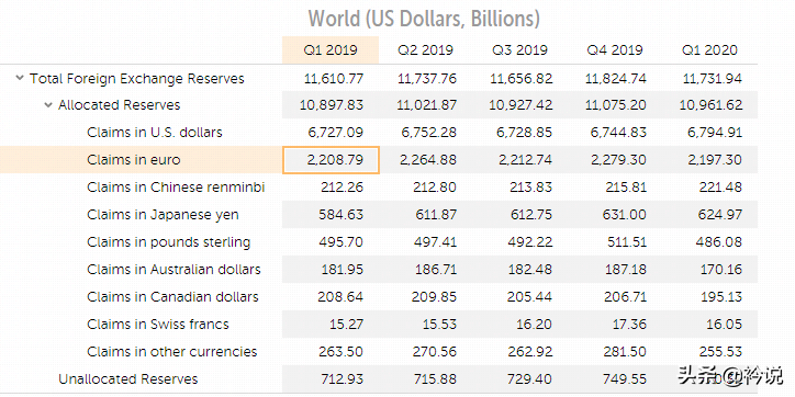 在今年一季度中,欧元的外汇储备占全球的20.05%,而去年四季度其所占的比例为20.5%,下降了0.45%。