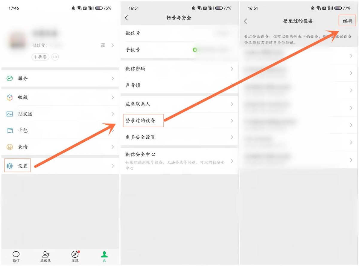 打开微信【设置】。选择【账号与安全】,然后选中【登录过的设备】,点击【编辑】,这个时候所有设备记录后面都会出现红色的【删除】,选择要删除的设备,然后点击【完成】就可以了。