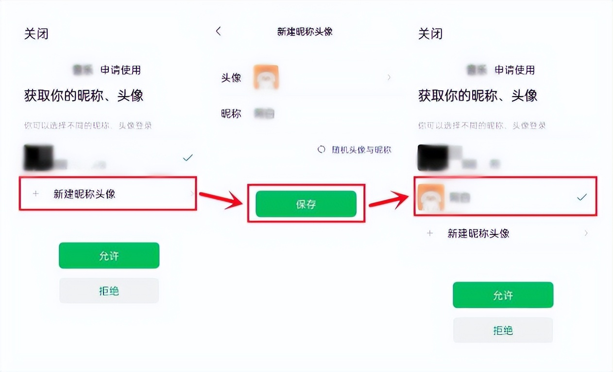 在其他软件“申请使用获取你的昵称、头像”的界面里,点击【新建昵称头像】,我们可以自己上传头像、自定义昵称,也可以选择【随机头像与昵称】,然后点击【保存】,这个时候会回到申请界面,点击新建的头像就可以啦。