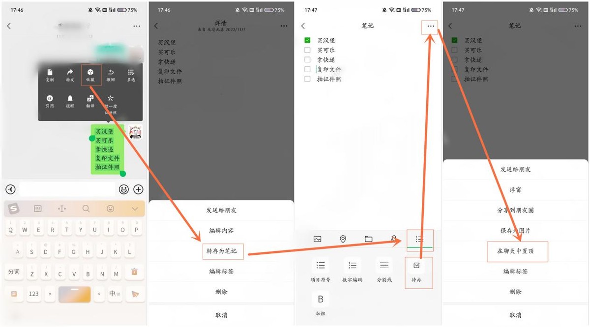 ②接下来在微信收藏里把这些事情转为笔记,然后点击右下方的编号图标,将事情设置为待办事项就可以了