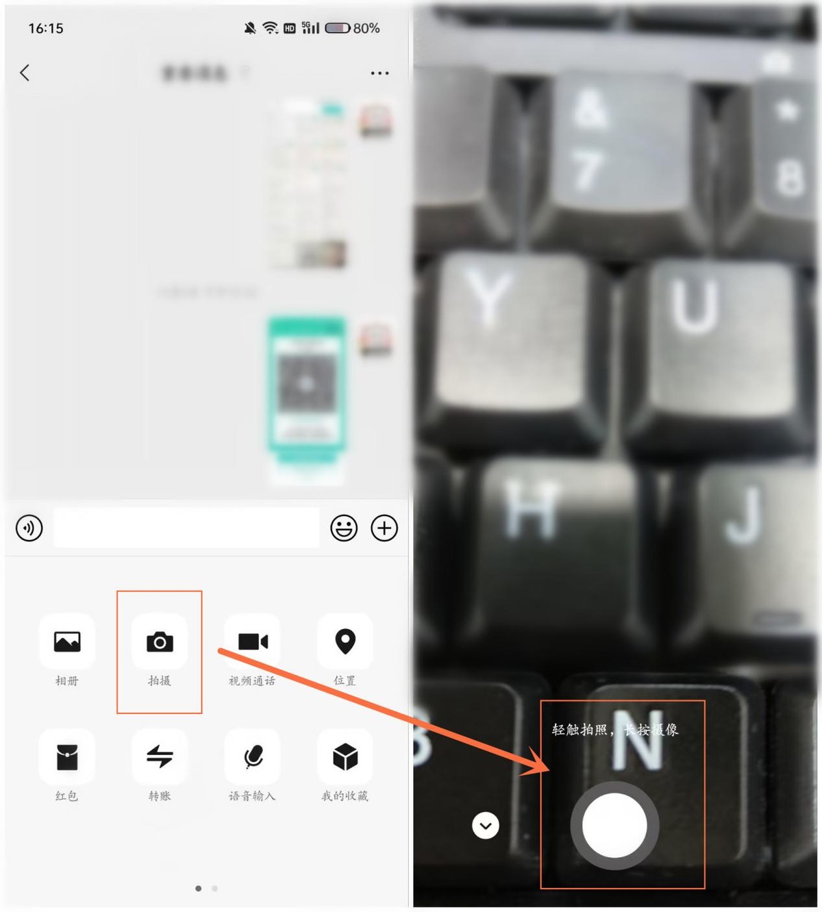 长按【相册】,就可以在微信启用系统相机,拍摄的图片可以直接在微信聊天页面发送,不需要拍摄完再打开微信。
