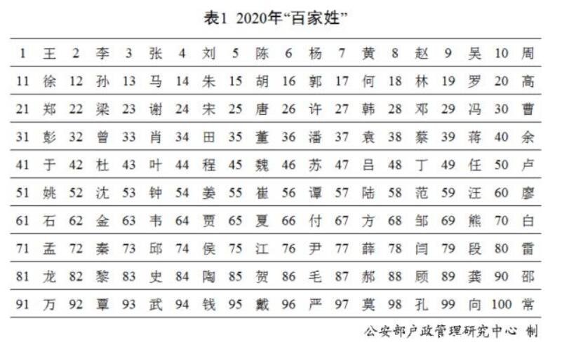从这个表中可以看出,王姓的人数是最多的,王、李、张、刘四个大姓基本上稳居了前四,近几年是不会改变了,而王、李、张、刘、陈五个姓氏加起来占据了全国总人口的30.8%,可见这些姓氏的影响力之大。而在2020年中,出生儿童最多的姓氏是李姓,而最少的则是顾姓。