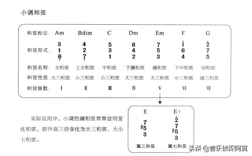 小调和弦里,主 下属 属 的和弦发生了变化,跟对应的关系大调和弦完全相反。