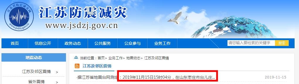 据江苏省地震台网测定:2019年11月15日15时04分,在山东枣庄市台儿庄区(北纬34.58度,东经117.74度)发生1.8级地震,震源深度大约6公里。