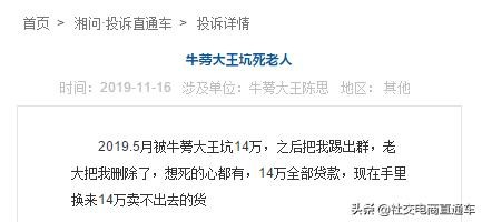 代理商投诉3:2019.5月被牛蒡大王坑14万,之后把我踢出群,老大把我删除了,想死的心都有,14万全部贷款,现在手里换来14万卖不出去的货