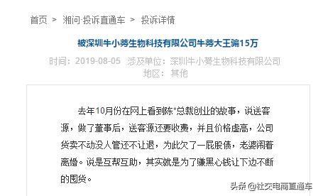 代理商投诉7:去年10月份在网上看到陈*总裁创业的故事,说送客源,做了董事后,送客源还要收费,并且价格虚高,公司货卖不动没人管还不让退,为此欠了一屁股债,老婆闹着离婚。说是互帮互助,其实就是为了赚黑心钱让下边不断的囤货。