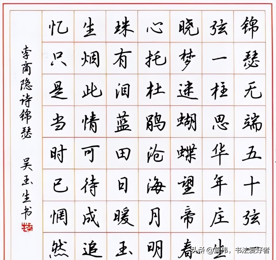 吴玉生的硬笔楷书,用笔干净利落,字形疏朗大方,整体显得清雅高洁,带给人一种“端庄杂流丽,刚健含婀娜”的美感。