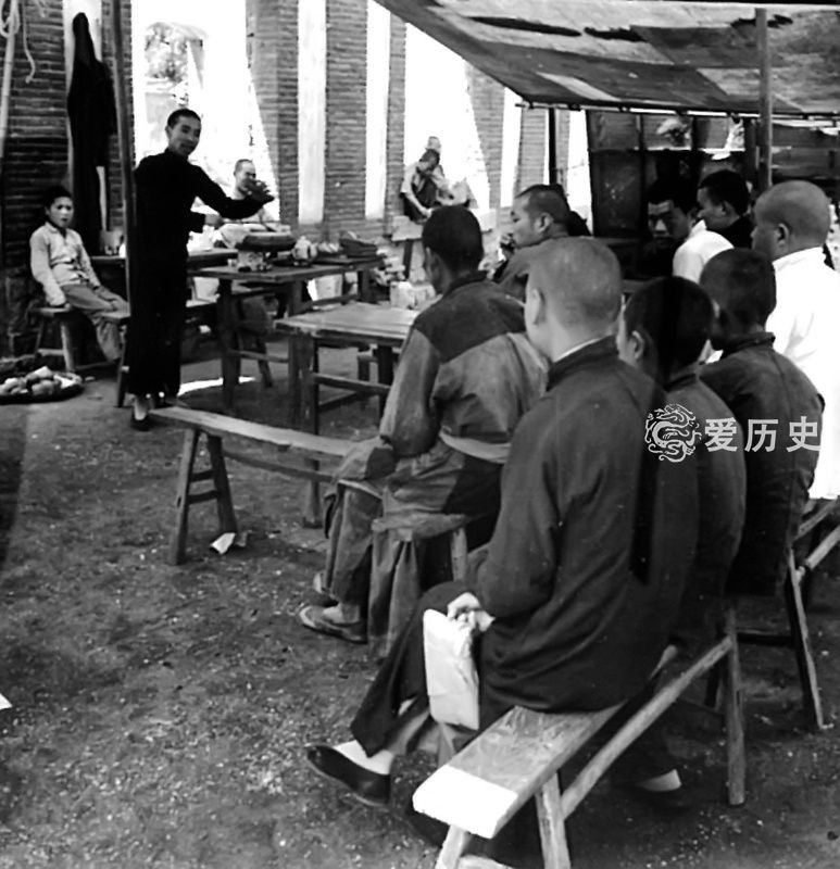 刘立福:不一样。那时候是个书场儿形式,没有台,就是书场当中有一块长圆的空地,迎面搁一张桌子,在桌子旁边,一般在左手有个凳子或椅子,那是量活坐的地方,量活的叫捧哏的。这个逗哏的呢,站的距离他有两米多远,观众围在周围,坐的都是大长条的凳子。鸟市声远茶社,一进去这门,迎门有一米多空地,摆三排凳子,两边摆四排,后边是给说书的预备的台,不说书那台空着,台上还可以搁两排凳子。听相声的一进去找地儿就坐下了,那时候也不买票,一段一要钱,打零钱。