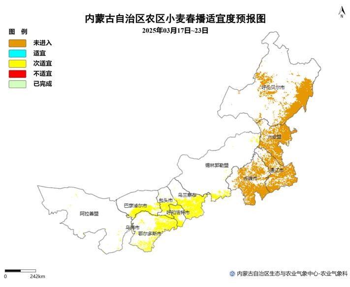 目前,我区西部地区的麦播工作已经陆续展开,其中巴彦淖尔市零星播种;其余农区冻土层逐步解冻,正处于备耕阶段,预计西部区春小麦于3月下旬至4月上旬陆续开始播种。