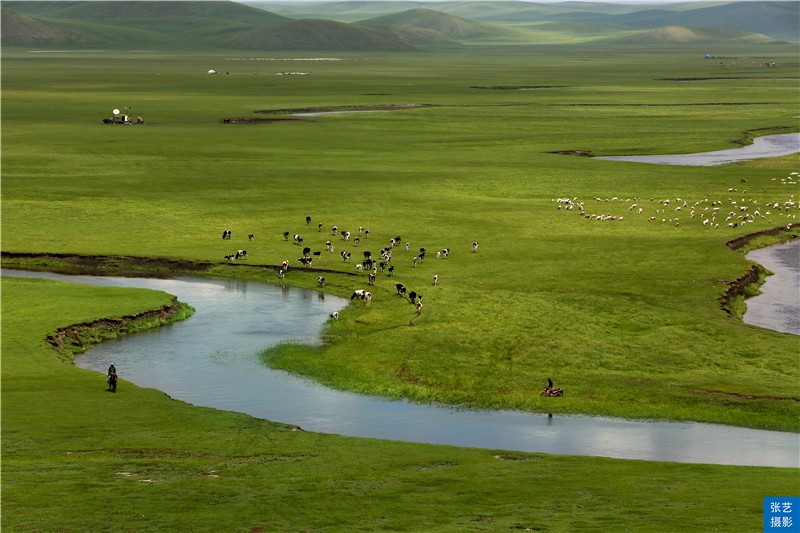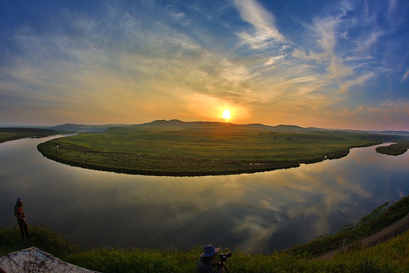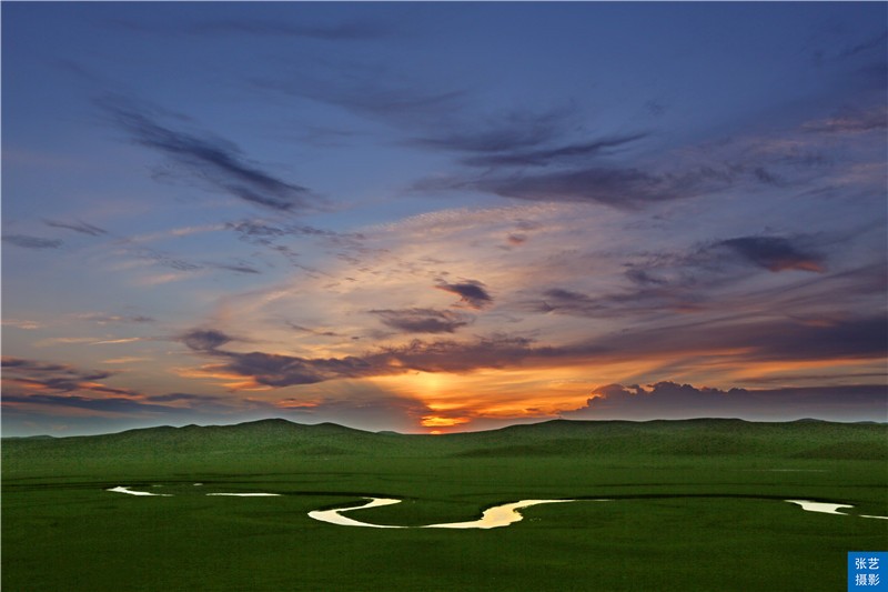 流连老舍笔下的莫日格勒河是一条河道十分狭窄,但却极度弯曲的河流。从空中俯瞰,蜿蜿蜒蜒的河水,就象是一条被劲风舞动着的蔚蓝色绸带,悠然飘落在碧绿如玉平坦无垠的大草原上,其弯曲程度,用九曲十八弯来形容是远远不够的;它顺流逆流,对流倒流,往往返返,迂回曲折,顾盼流连,忘情地抚弄着草原的肌肤,全部流程几乎都是在弯曲的流动中完成的,如诗的婉约韵律,如画的飘逸线条,如歌的跳跃音符,如书法的酣畅墨意。莫日格勒河之曲,却纯粹是大自然的天工造化,没有一点儿斧凿之处是真正的原生态景观。