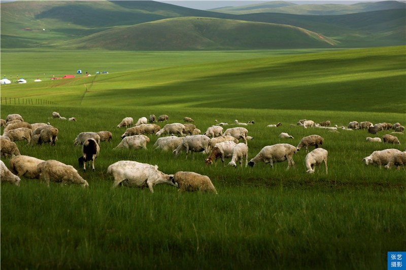 白色的羊群在山坡上吃草。远远望去,好像是白云飘浮在山间,又好似一粒粒珍珠撒落在草原上。 微风吹过,草浪滚滚,形成了一片绿色的海洋。牧羊的姑娘,唱着动听的情歌,挥动着羊鞭,游走在美丽的草原上。傍晚,夕阳西下的时候,在霞光的辉映下,草原与天连成一片。蒙古包里响起了委婉动听的马头琴声,这动与静相结合的草原美景,怎不叫人心旷神怡。