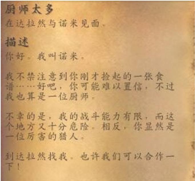 “算是一位厨师?作为玩家的我们难道白教你了吗?更可气的是因为食谱的升级只能由诺米完成,而他却经常烧焦食物,并且大言不惭的以”自己战斗力有限“为由让玩家再出去寻找,然后继续烧焦。