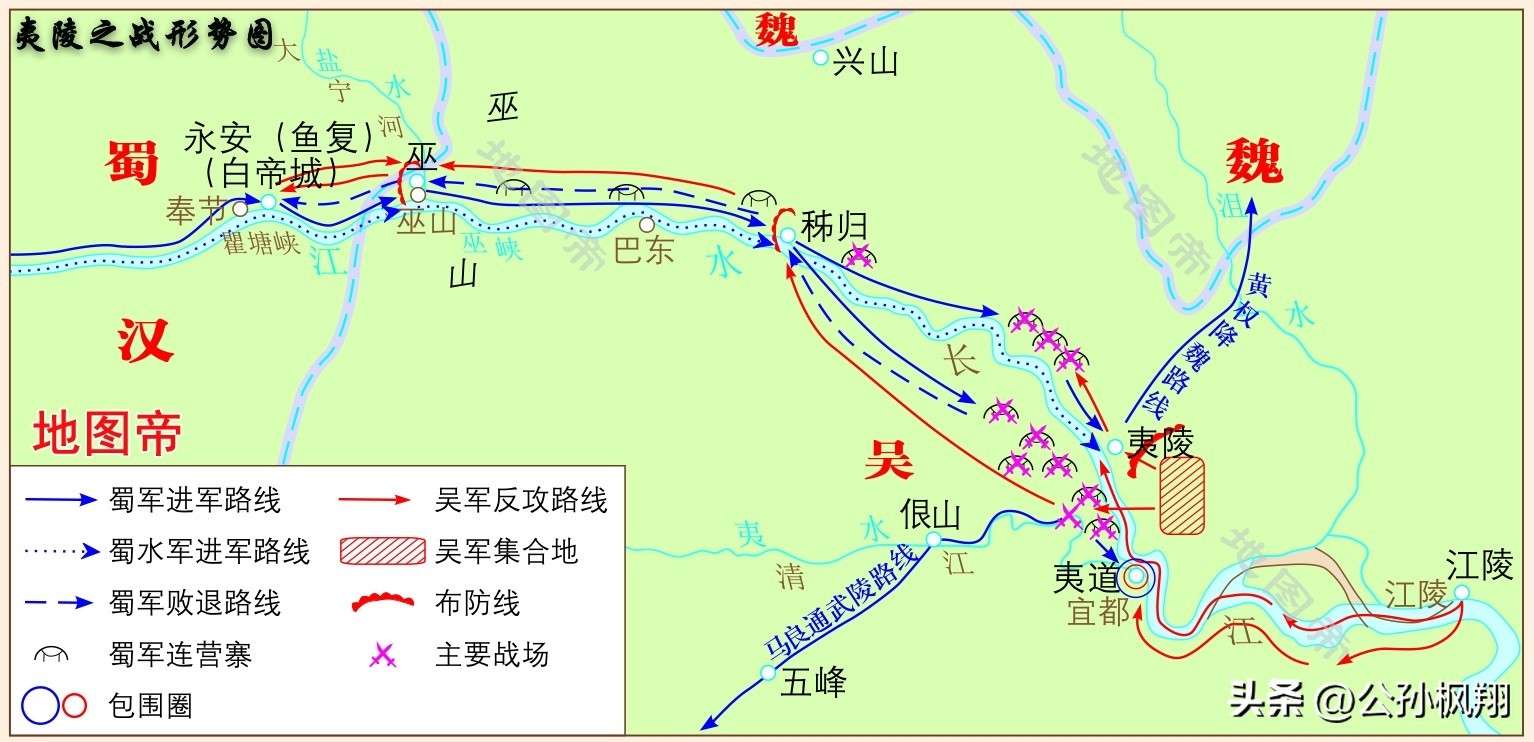 这一章节说的大部分内容可能大家都耳熟能详,那么这里再补充一点小细节。所谓的夷陵之战,指的是自刘备起兵伐吴开始到退回白帝城的全过程,这中间包含了许多次大小战斗。其中最主要的战场有两处,分别在夷道跟夷陵两个县,最关键的猇亭战场就位于夷陵县。